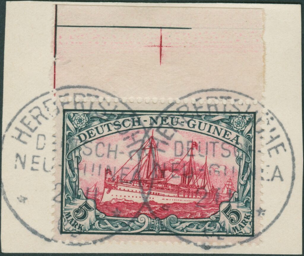 1901, März. Freimarkenausgabe Kaiseryacht (Landesname Deutsch-Neu-Guinea), hergestellt im Stichtiefdruck im Bogen zu 4 x 5 Marken ohne Wasserzeichen, Michel-Nummer 19, gezähnt K141/2 oder K141/4. Gültigkeit der Marke bis 17. September 1914 (Kapitulation)
